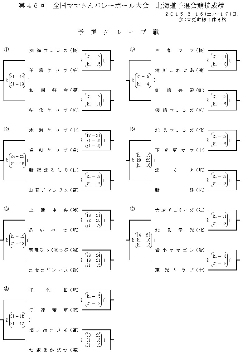 | 第46回全国ママさんバレーボール大会 北海道予選会 | 2015/5/16(土)~17(日) | 音更町総合体育館 | 大会要項(pdf) |