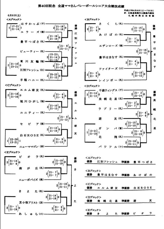 | 第40回記念全道ママさんバレーボール シニア大会 | 2015/6/6(土)・7(日) | 北海道立真駒内屋内競技場 札幌市南区体育館 |