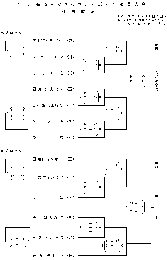 | '15北海道ママさんバレーボール親善大会 | 2015/7/12(日) | 日高町立門別総合町民センター 日高町立門別小学校 |