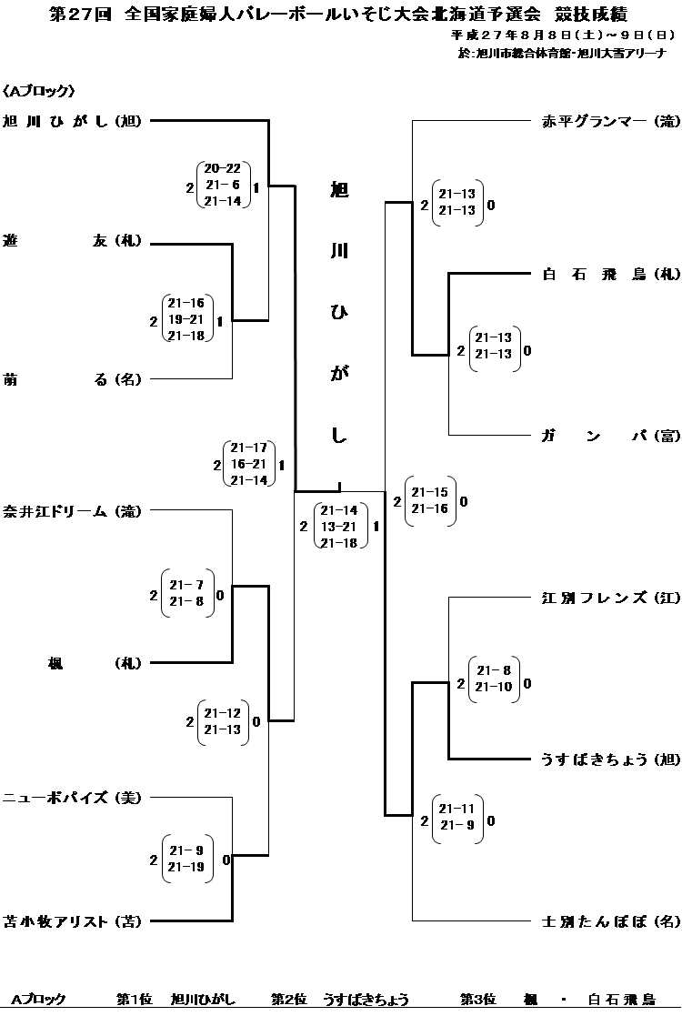 | 第27回全国家庭婦人バレーボールいそじ大会 北海道予選会 | 2015/8/8(土)~7(日) | 旭川総合体育館 旭川大雪アリーナ |