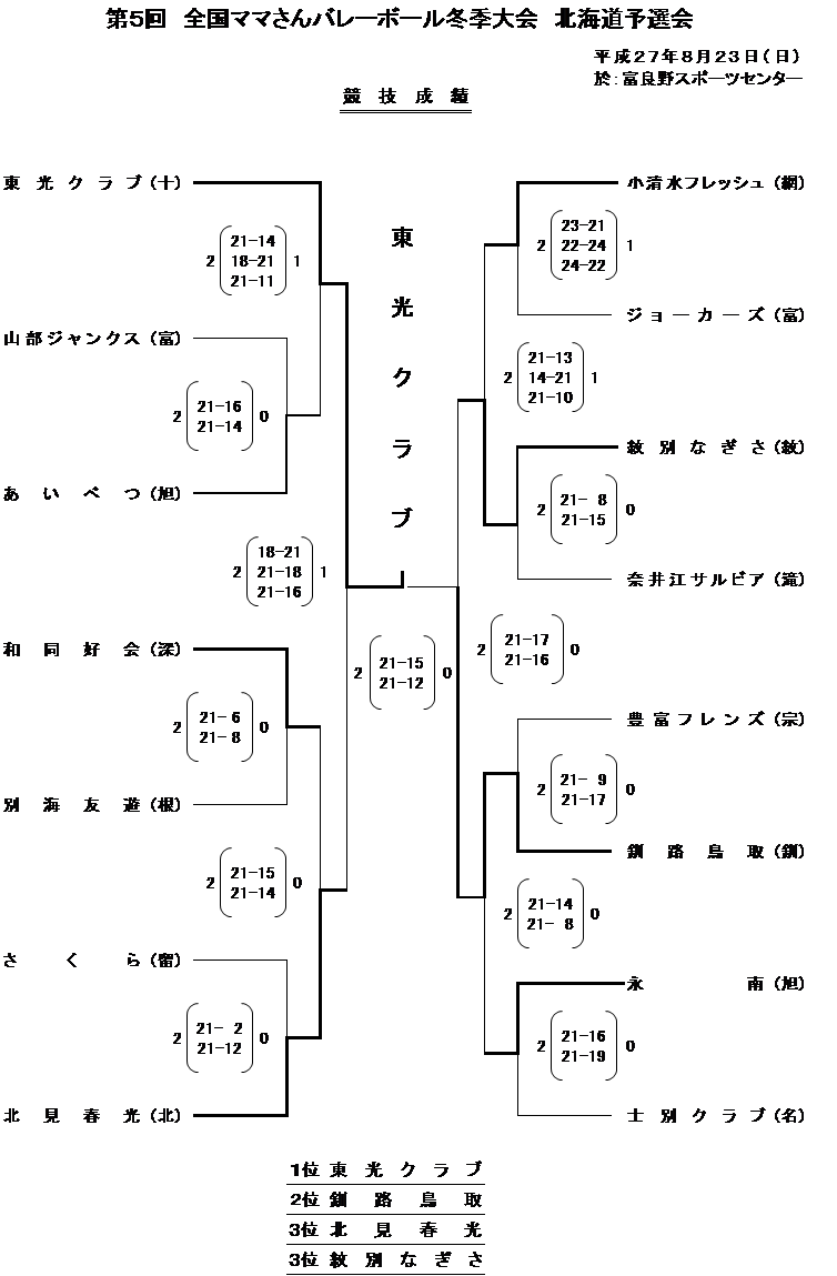 | 第5回全国ママさんバレーボール冬季大会 北海道予選会 | 2015/8/23(日) | 富良野スポーツセンター | 大会要項(pdf) | 競技成績(png) |