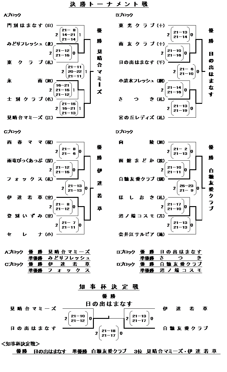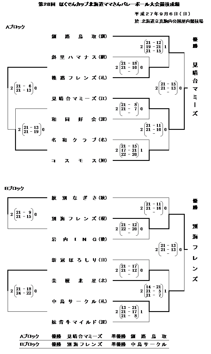 | 第28回ほくでんカップ北海道ママさんバレーボール大会 | 2015/9/6(日) | 北海道立真駒内公園屋内競技場 | 大会要項(pdf) |