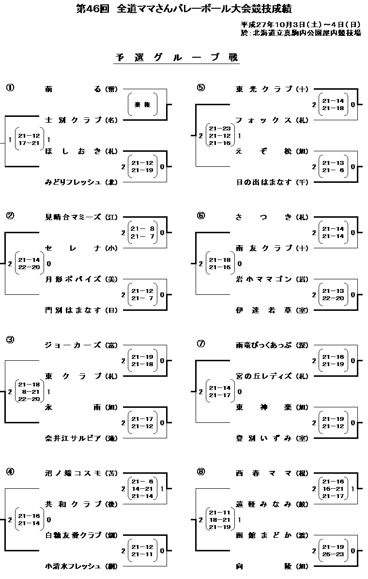 | 第46回全道ママさんバレーボール大会 | 2015/10/3(土)~4(日) | 北海道立真駒内公園屋内競技場 | 大会要項(pdf) |